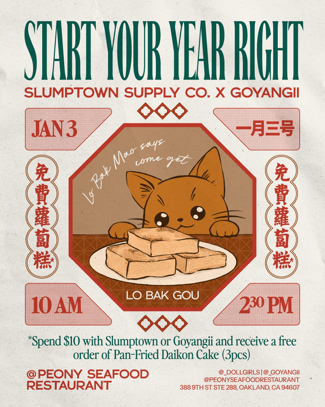 Come start your New Year off right with @_DOLLGIRLS and @_GOYANGII for their first joint pop-up at Peony Seafood Restaurant! Come shop with them and enjoy some dim sum! Purchases over $10 from either artist will receive a voucher for one FREE order of pan-fried daikon cake (3pcs)!