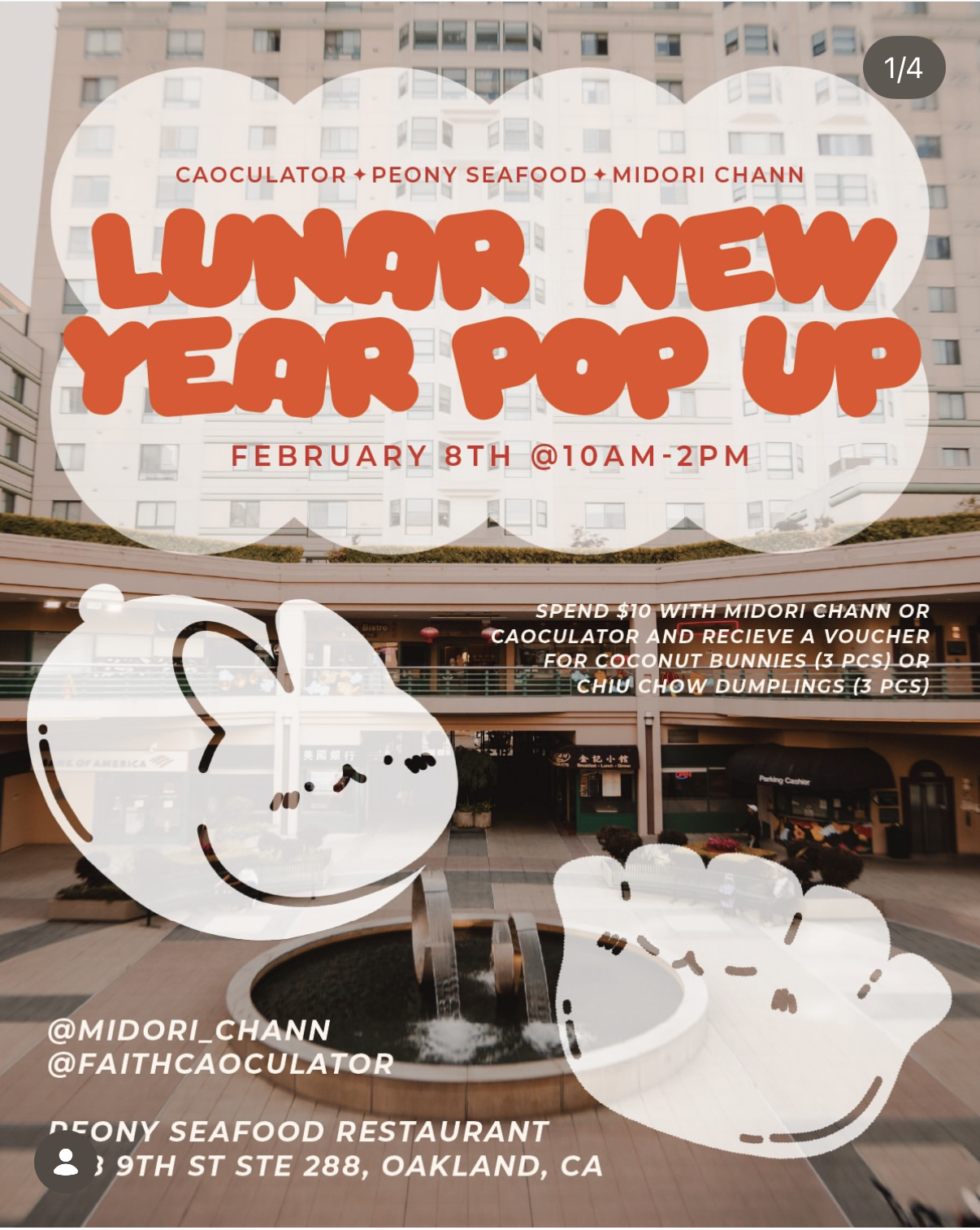 Celebrate the Lunar New Year with @midori_chann and @faithcaoculator for this special pop up from 10am-2pm! For every purchase over $10, you'll receive a voucher for chiu chow dumplings or coconut bunnies!